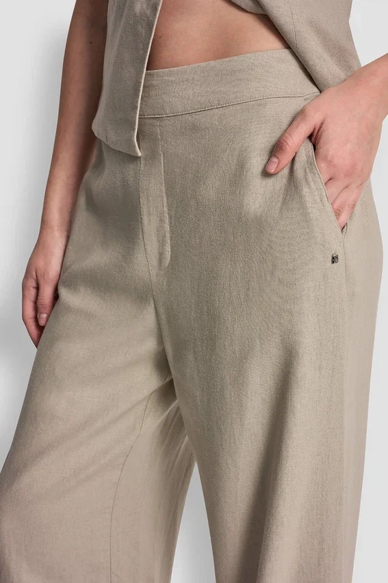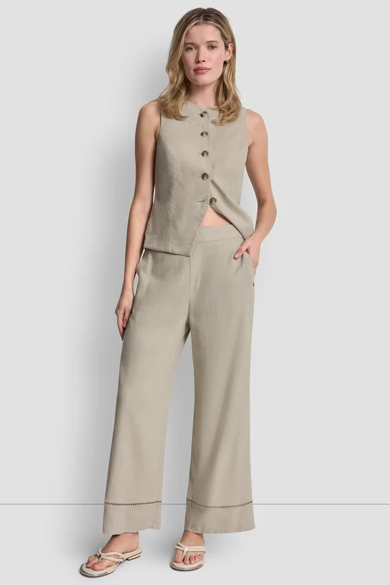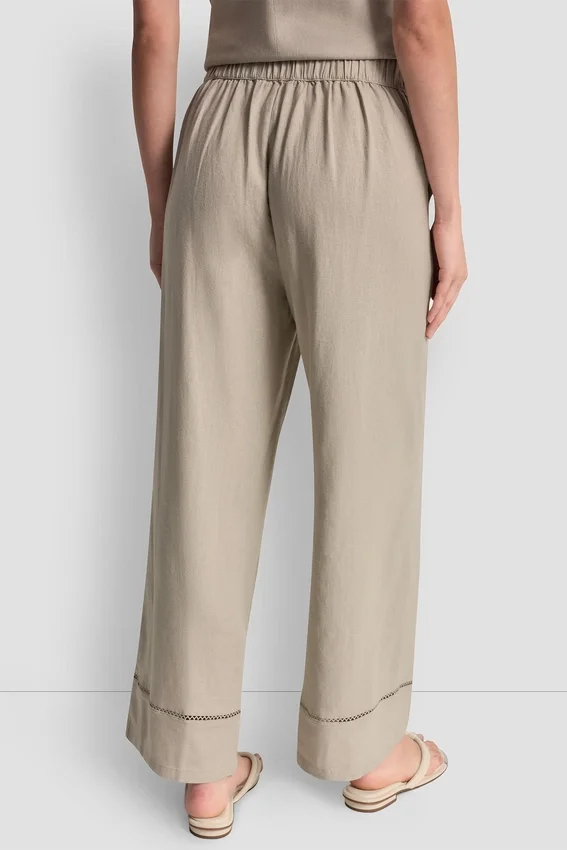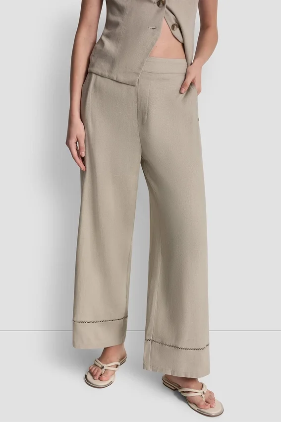 Ligeros y de un estilo refinado y desenfadado, estos pantalones de talle alto tobilleros están confeccionados en una mezcla transpirable de lino y rayón. Diseñados con una silueta de pierna ancha y un delicado detalle de encaje en los dobladillos, ofrecen un look elegante y a la vez cómodo para el clima cálido.