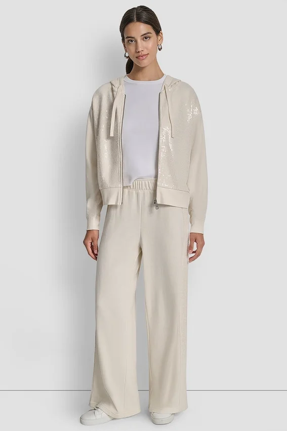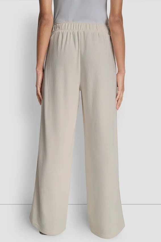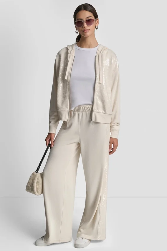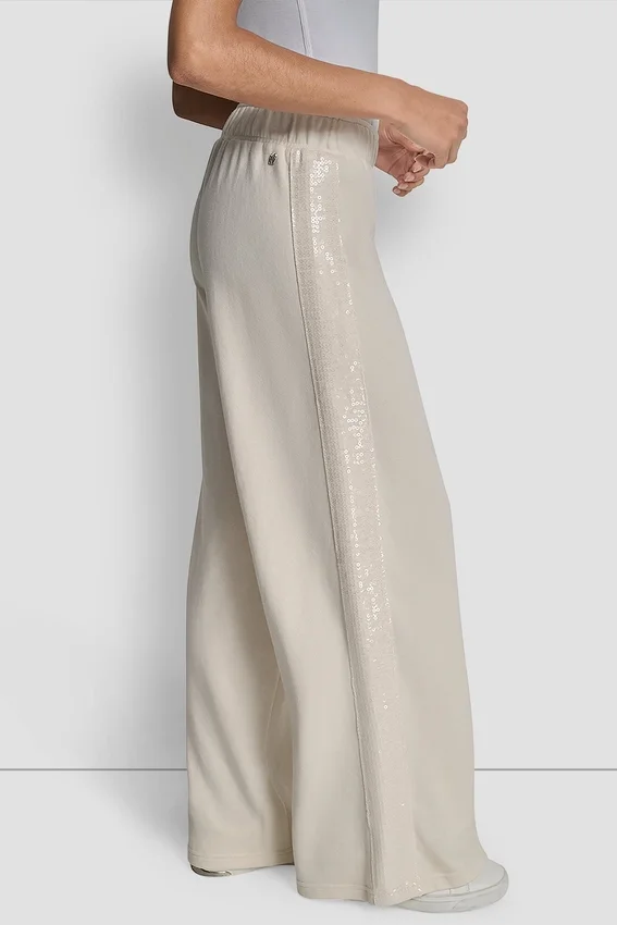 • Pantalones de pierna ancha con cintura media y rayas de lentejuelas en las costuras laterales