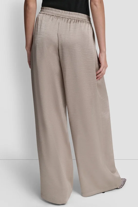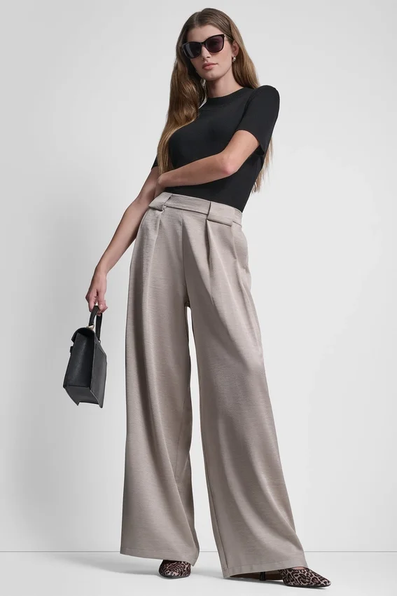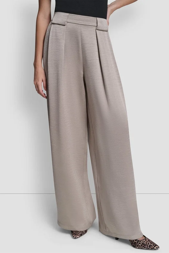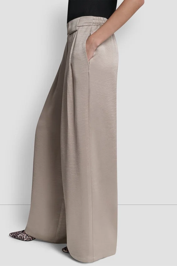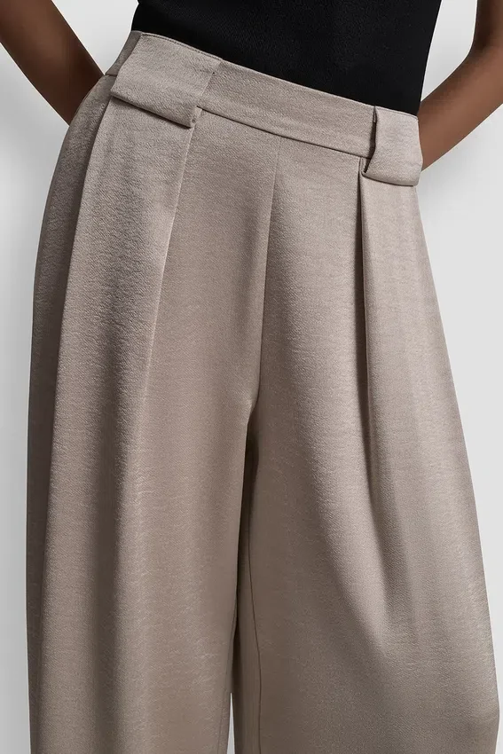 Descubre tu prenda imprescindible para salir de fiesta en el centro: pliegues de cintura alta y pierna ancha fluida, realzados por un lujoso satén; combínalos con una parte de arriba de manga hasta el codo y un bolso Satchel elegante.