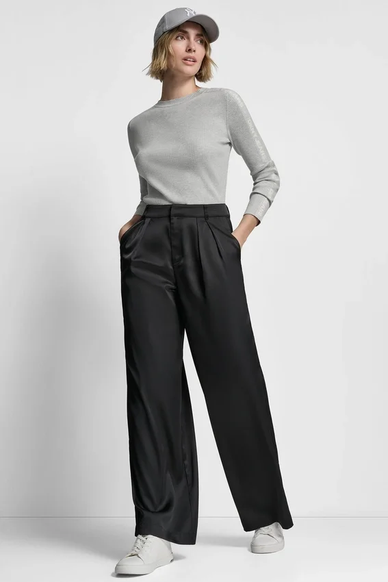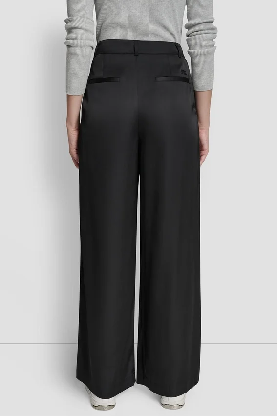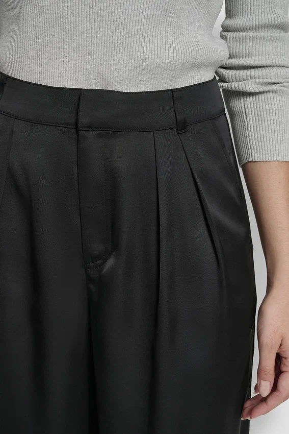 Una versión refinada de la vestimenta de sastrería, estos pantalones de talle alto con pliegues están confeccionados en un satén pesado y fluido que cae con naturalidad. La silueta de pierna ancha ofrece un look limpio y estilizado, perfecto para el trabajo o para un look elegante de noche.