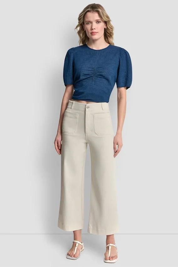 Una combinación perfecta de elegancia y comodidad, estos pantalones de tiro alto, corte corto y pierna ancha están confeccionados en sarga elástica texturizada para ofrecer estructura con la elasticidad justa.