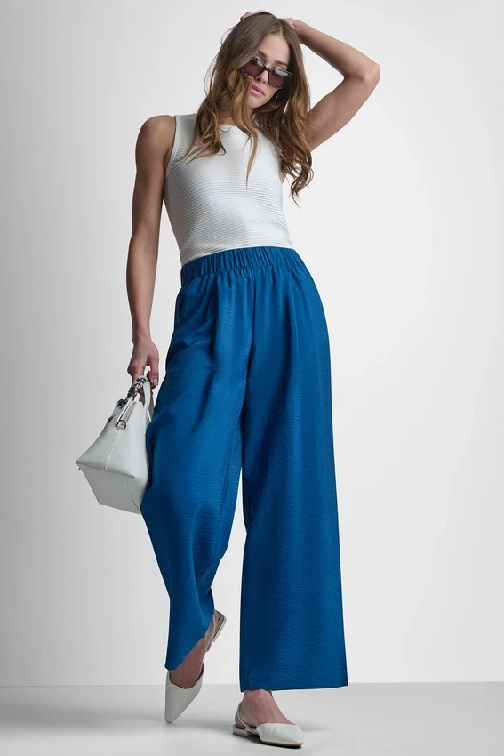 Pantalón tobillero de tiro medio y pierna ancha. Sin cordón. Dos bolsillos traseros. Sin forro. Voile arrugado: 85 % rayón, 15 % nailon. Limpieza en seco o lavado a máquina en ciclo delicado con agua fría, secar colgado. Importado. Estilo n.º: P6Ck7Ehm