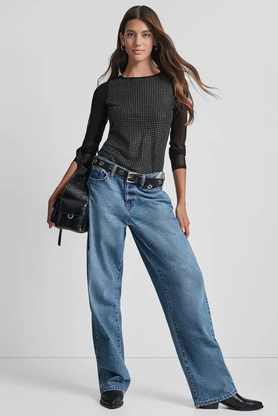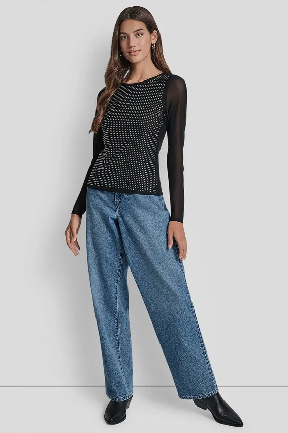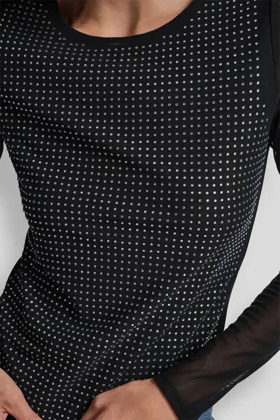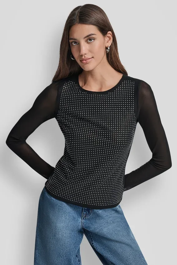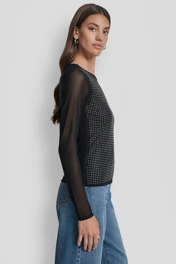 - Top de malla de manga larga con cuello redondo y tachuelas