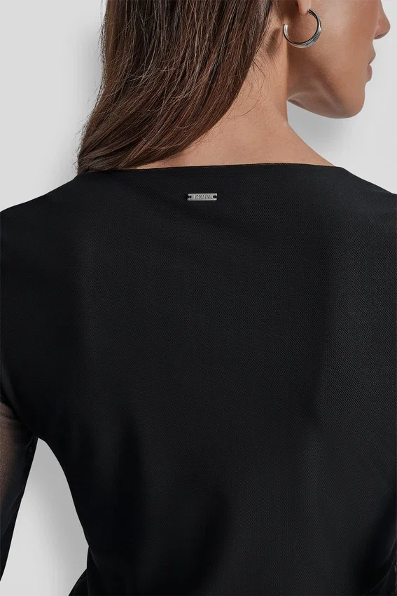 Top de cuello redondo con mangas largas de malla y tachuelas. Se pone por la cabeza. Sin forro. Jersey elástico: parte principal, mangas y forro del cuerpo: 95 % poliéster, 5 % spandex. Lavar a máquina en frío del revés. No limpiar en seco. Secar en horizontal. Importado. N.º de estilo: Dj5T1581