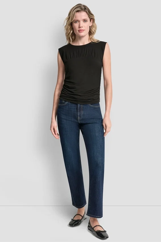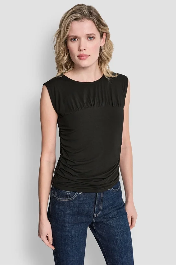Elegante sin esfuerzo, esta parte de arriba sin mangas cuenta con un corpiño fruncido que le aporta textura y forma, lo que lo convierte en una prenda versátil para combinar con otras o llevar sola. Sus líneas limpias y su tejido elástico y suave crean un ajuste favorecedor que se adapta a la perfección tanto para el día como para la noche.