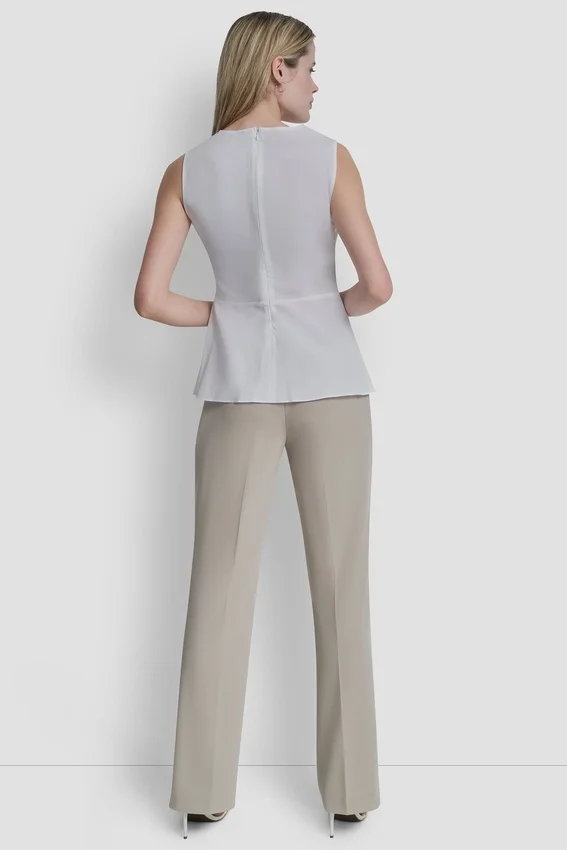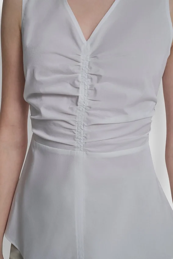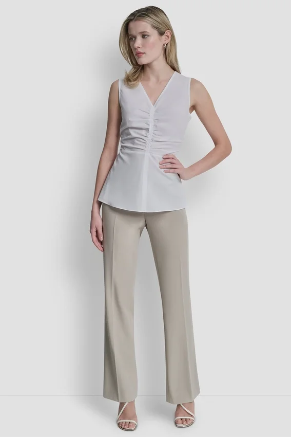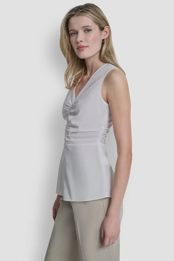 Elegante y favorecedora, esta blusa sin mangas está diseñada con suaves fruncidos en la parte delantera y un dobladillo con volantes ligeramente acampanado para crear una silueta femenina. El escote en V le da un toque refinado, mientras que la cintura entallada crea una forma elegante, perfecta para un look de oficina o para llevar a diario con un toque sofisticado.