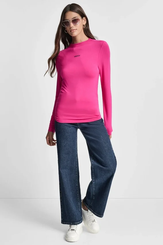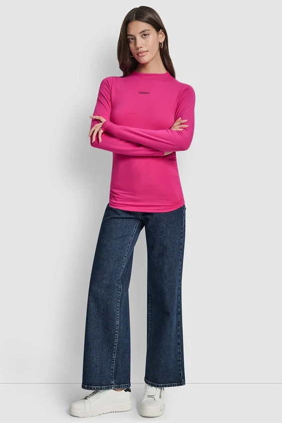 Partes De Arriba de cuello alto y mangas largas con fruncidos laterales y logotipo de pedrería Cuello alto en forma de embudo con diseño para poner por la cabeza Corte ajustado para una silueta elegante Mangas largas Panel delantero forrado con el mismo tejido 94 % rayón, 6 % mezcla de spandex Lavar a máquina en frío con colores similares; lavar del revés; secar en secadora a baja temperatura; planchar a baja temperatura si es necesario; no usar lejía; no usar