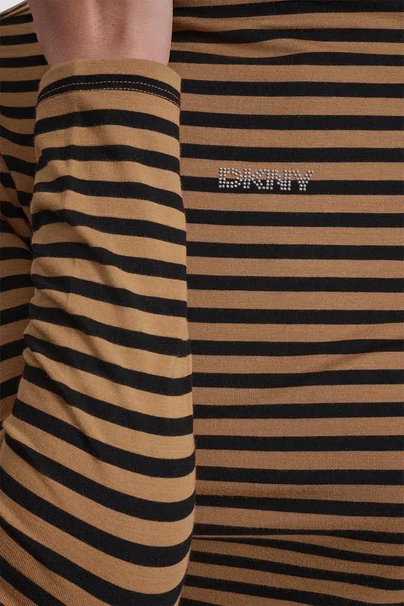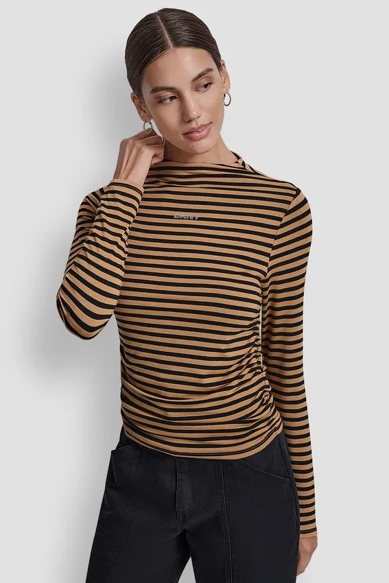 Partes De Arriba de cuello alto y mangas largas con fruncidos laterales y logotipo de pedrería Cuello alto en forma de embudo con diseño para poner por la cabeza Corte ajustado para una silueta elegante Mangas largas Panel delantero forrado con el mismo tejido 94 % rayón, 6 % mezcla de spandex Lavar a máquina en frío con colores similares; lavar del revés; secar en secadora a baja temperatura; planchar a baja temperatura si es necesario; no usar lejía; no usar