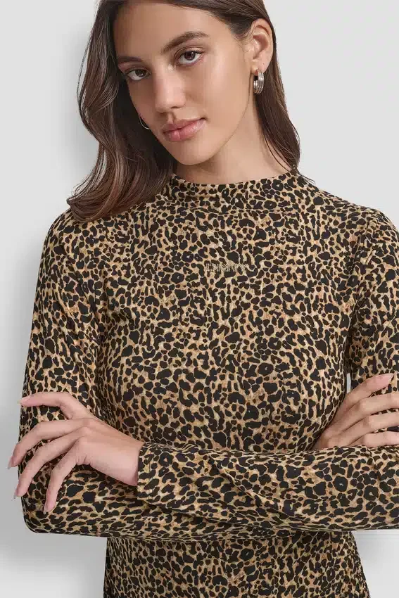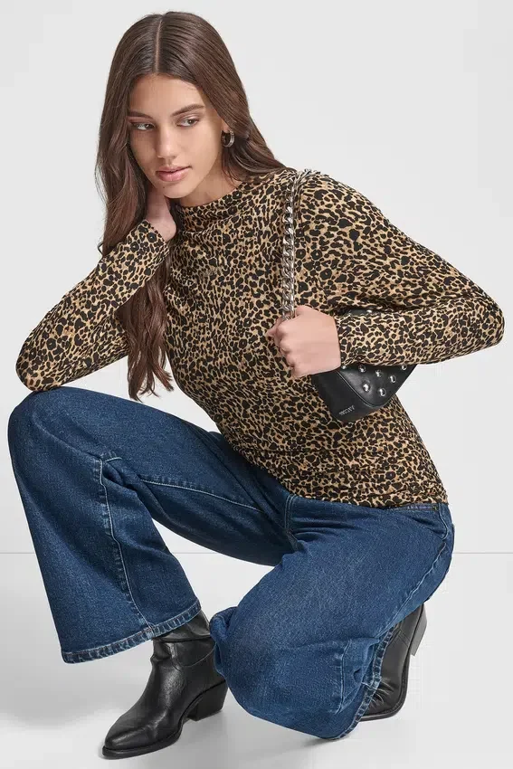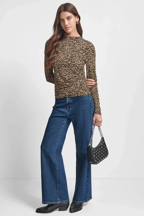 Partes De Arriba de cuello alto y mangas largas con fruncidos laterales y logotipo de pedrería Cuello alto en forma de embudo con diseño para poner por la cabeza Corte ajustado para una silueta elegante Mangas largas Panel delantero forrado con el mismo tejido 94 % rayón, 6 % mezcla de spandex Lavar a máquina en frío con colores similares; lavar del revés; secar en secadora a baja temperatura; planchar a baja temperatura si es necesario; no usar lejía; no usar