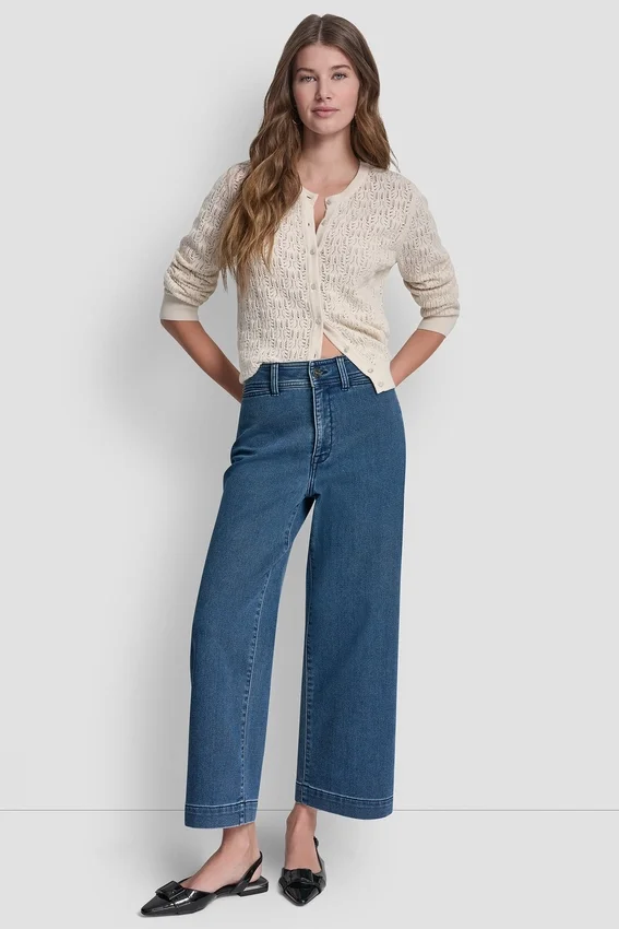 Pantalones de talle alto tobilleros Cierre con cremallera y botones Bolsillos rectos Largo corto Dos bolsillos delanteros Dos bolsillos de la espalda 82 % algodón, 17 % poliéster, 1 % elastano spandex Lavar a máquina en frío, secar en secadora a baja temperatura Importado Estilo n.º: Dj6P3125