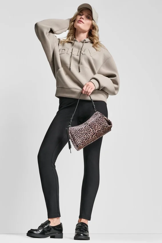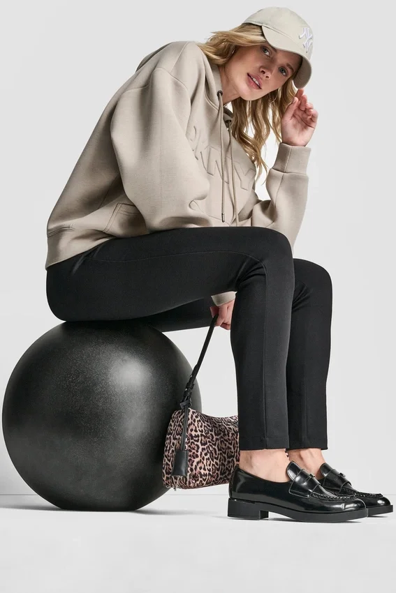 Mantén un look pulido, pero a la vez casual y desenfadado, con esta sudadera con capucha y logotipo sobre un elegante vestido midi de cuero y botines sin cordones.