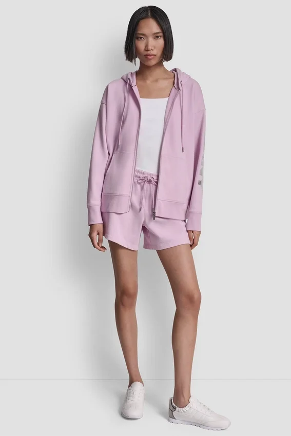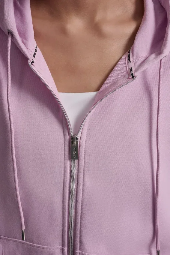 Sudadera con capucha y logo metalizado, mangas largas con hombros caídos y capucha con cordón de ajuste. Cierre con cremallera completa. Dos bolsillos canguro delanteros. Parcialmente forrada. Tejido de rizo francés de mezcla de algodón: Principal: 60 % algodón, 40 % poliéster; Capucha forrada de felpa. Lavar a máquina en frío del revés — No limpiar en seco — Secar en horizontal. Importada. Estilo n.º: Dp6J9715