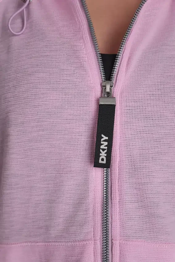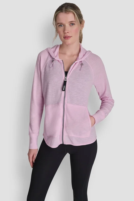 Chaqueta de manga raglán larga con costuras planas y capucha con cordones elásticos. Cierre con cremallera completa. Dos bolsillos canguro delanteros. Sin forro. Tejido exterior de mezcla de algodón con punto mini waffle: 89 % poliéster, 11 % elastano (spandex). Lavar a máquina en frío del revés; no usar lejía ni suavizante; secar en secadora a baja temperatura. Importada. N.º de estilo: Dp4J9404