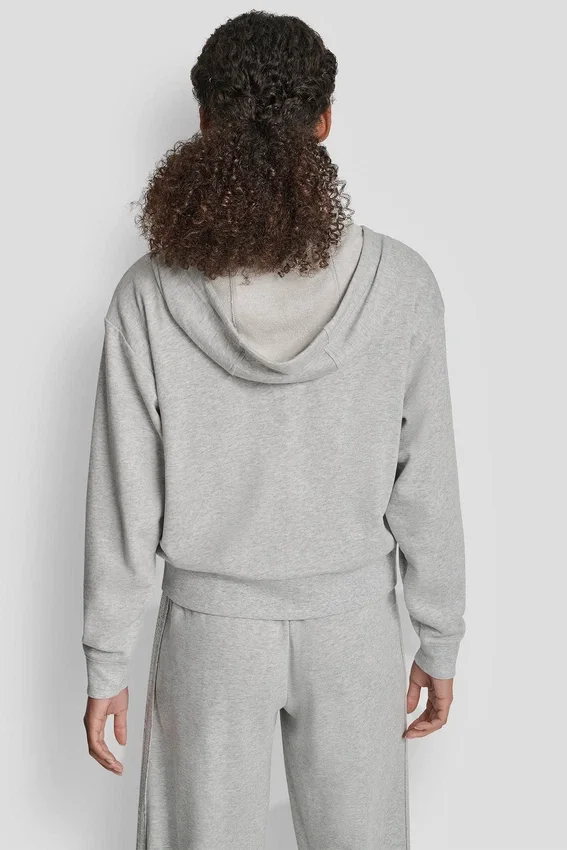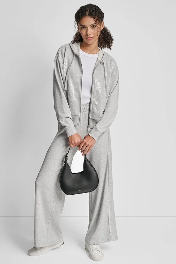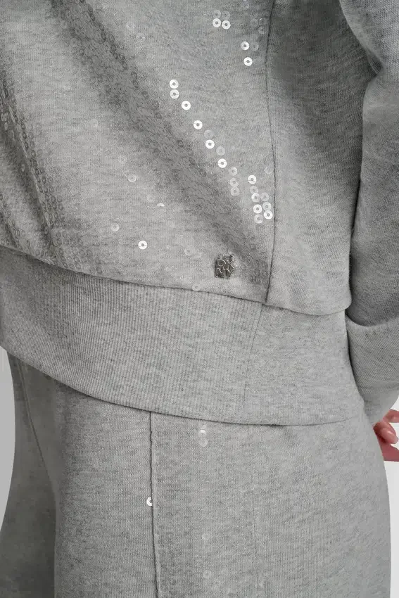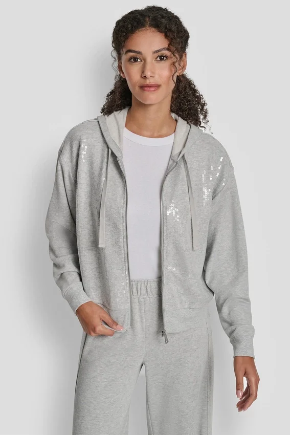 Añade un toque de glamour a tu día a día con esta sudadera con capucha y cremallera, diseñada con detalles de lentejuelas en tonos similares para darle un toque brillante a una prenda básica informal. Confeccionada en una suave mezcla de algodón con un corte holgado para una comodidad que dura todo el día.