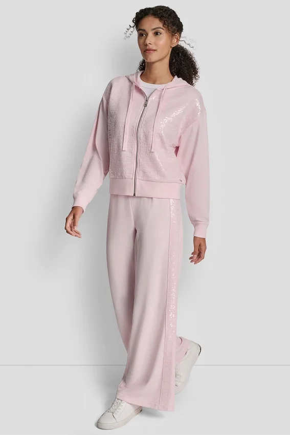 Añade un toque de glamour a tu día a día con esta sudadera con capucha y cremallera, diseñada con detalles de lentejuelas en tonos similares para darle un toque brillante a una prenda básica informal. Confeccionada en una suave mezcla de algodón con un corte holgado para una comodidad que dura todo el día.