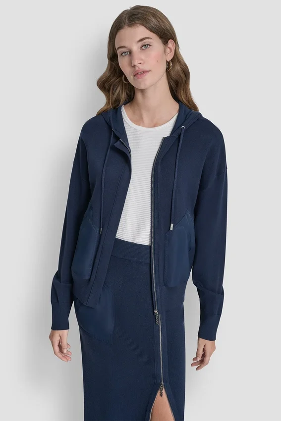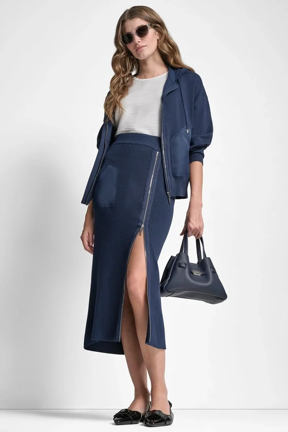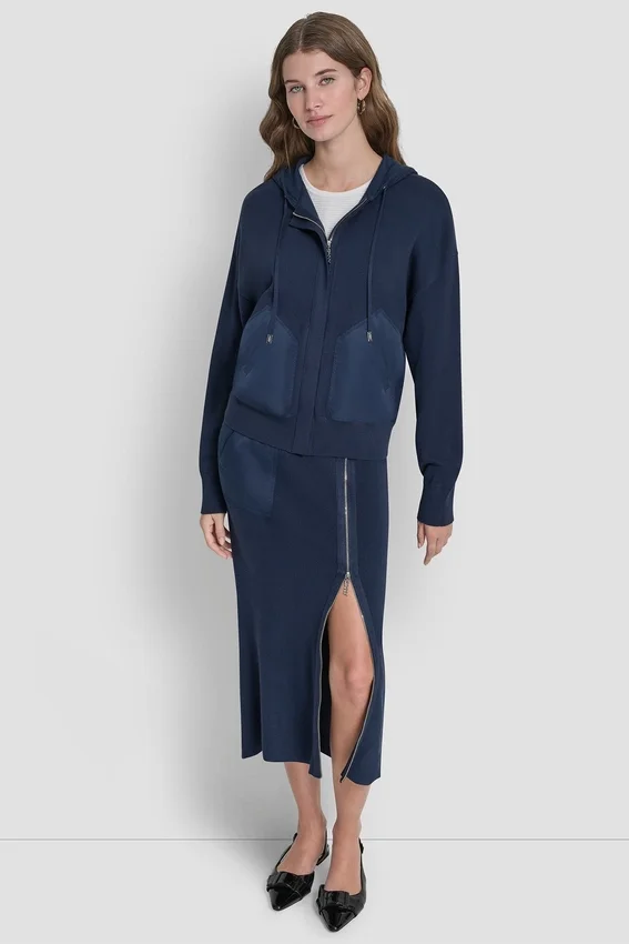 Una falda midi plisada encuentra su pareja ideal en esta sudadera deportiva con capucha; los botines con cordones completan el look deportivo y elegante.