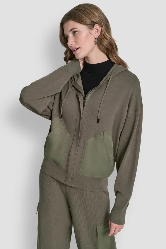 Una falda midi plisada encuentra su pareja ideal en esta sudadera deportiva con capucha; los botines con cordones completan el look deportivo y elegante.