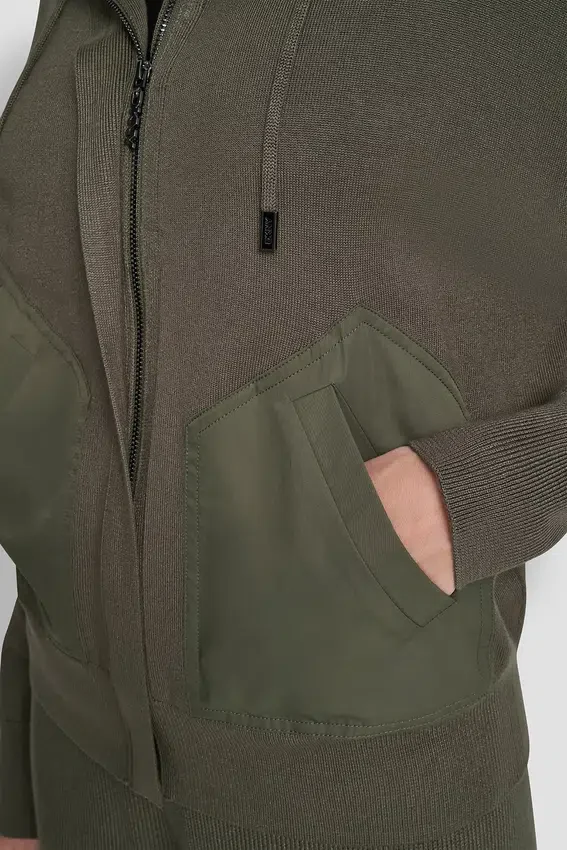 - tejido de punto: principal: 75 % viscosa de rayón, 25 % nailon; bolsillos exteriores: 100 % poliéster