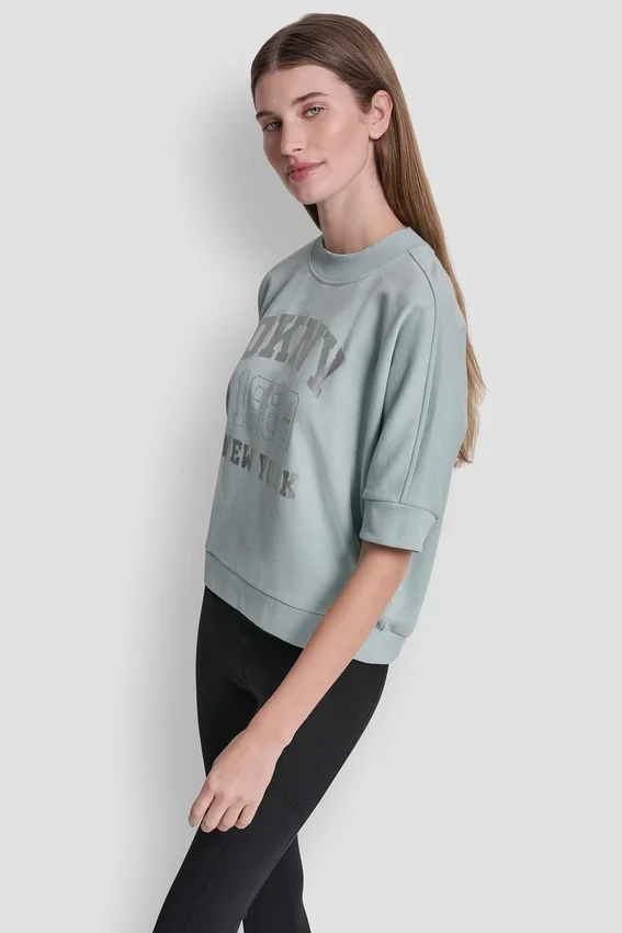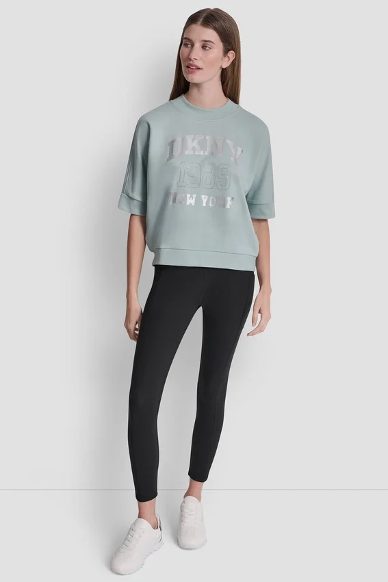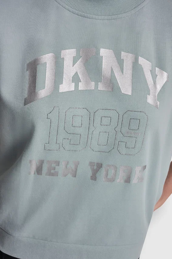 De estilo deportivo con un toque de brillo, este top con el logotipo de DKNY NY 1989 cuenta con adornos de pedrería y un moderno dobladillo asimétrico. Diseñado con mangas hasta el codo y un corte holgado, es una prenda esencial para el día a día.