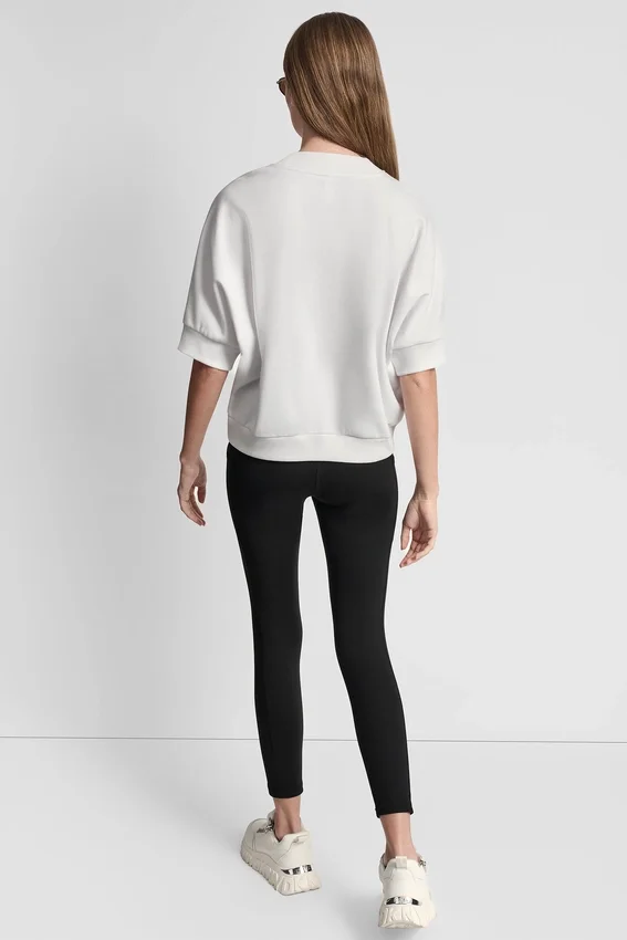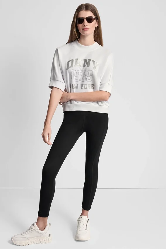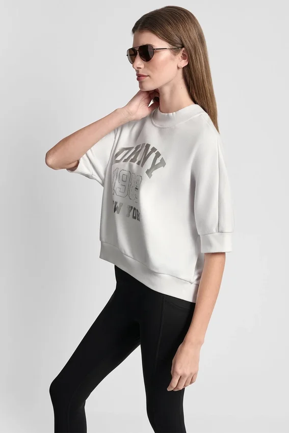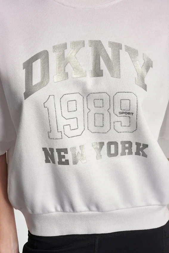 De estilo deportivo con un toque de brillo, este top con el logotipo de DKNY NY 1989 cuenta con adornos de pedrería y un moderno dobladillo asimétrico. Diseñado con mangas hasta el codo y un corte holgado, es una prenda esencial para el día a día.