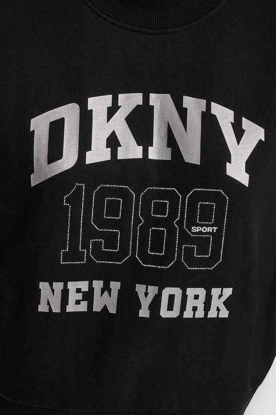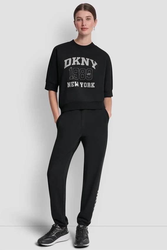 De estilo deportivo con un toque de brillo, este top con el logotipo de DKNY NY 1989 cuenta con adornos de pedrería y un moderno dobladillo asimétrico. Diseñado con mangas hasta el codo y un corte holgado, es una prenda esencial para el día a día.