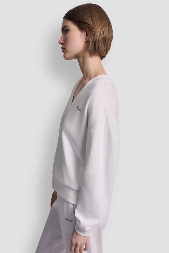 • Sudadera con logo burbuja metalizado, cuello en V profundo y mangas largas con hombros caídos