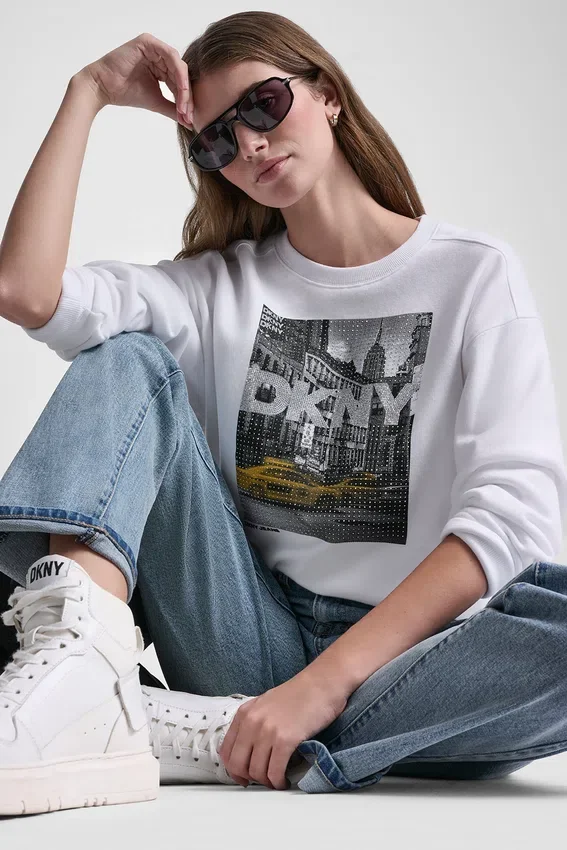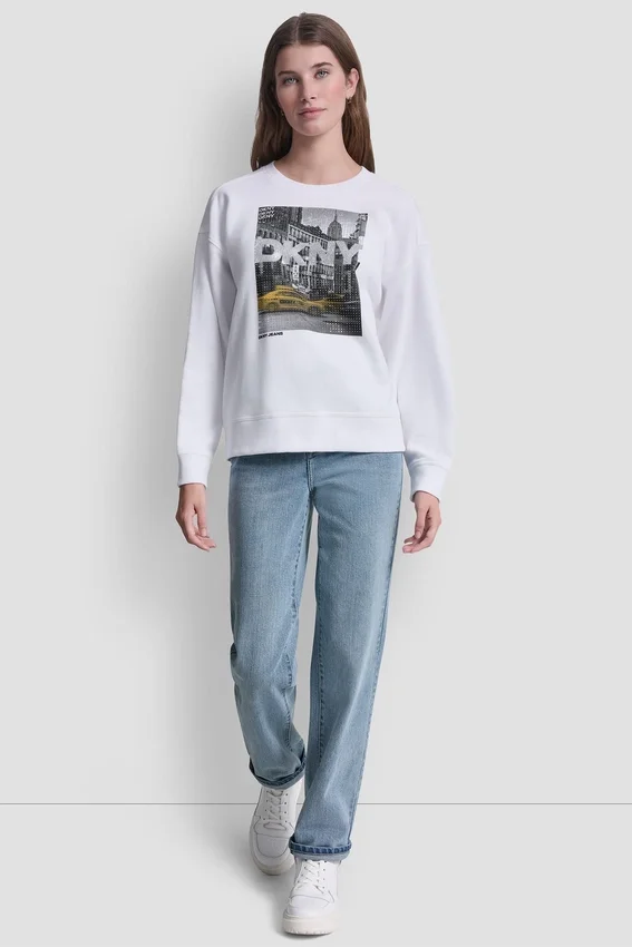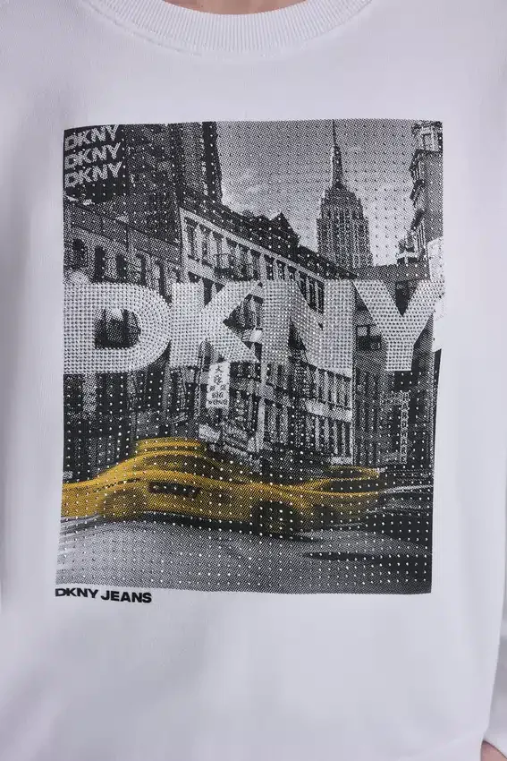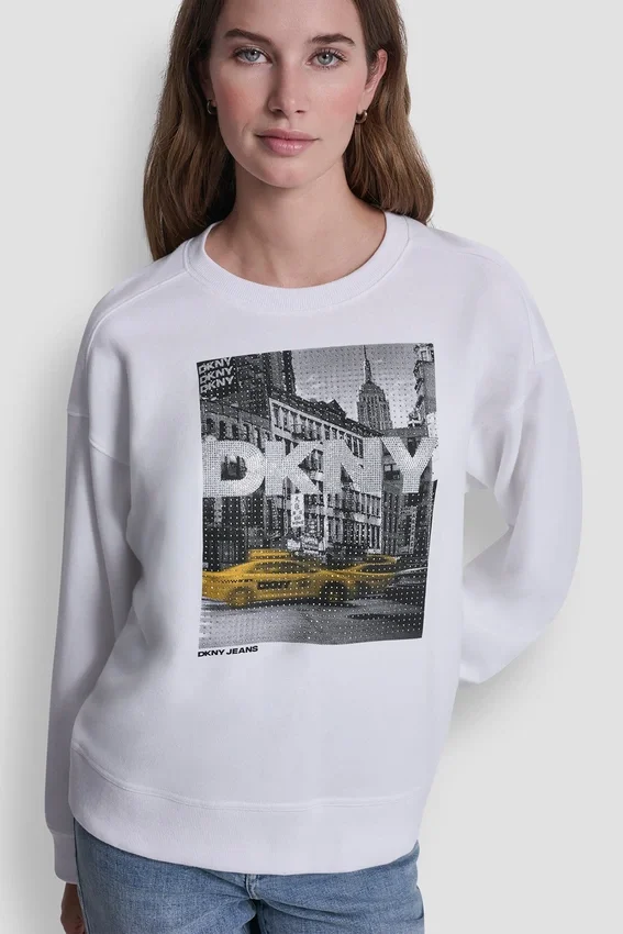 Atrevida y llamativa, esta sudadera de cuello redondo presenta un gráfico fotorrealista de un taxi de DKNY realzado con adornos de Pedrería para un brillo adicional. Confeccionada en algodón suave con un corte regular, ofrece un estilo llamativo con comodidad para el día a día.