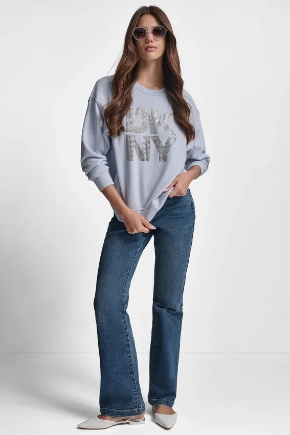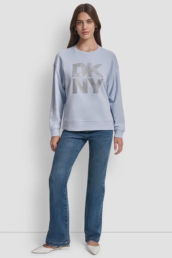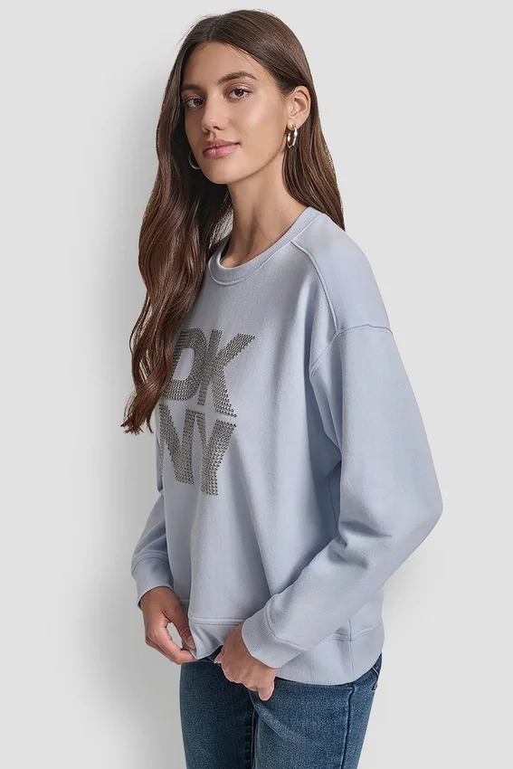 - Sudadera de cuello redondo con mangas largas de hombros caídos y logotipo apilado adornado con adornos de cristales