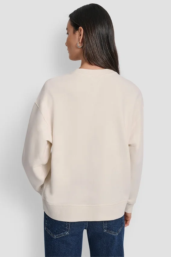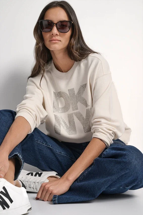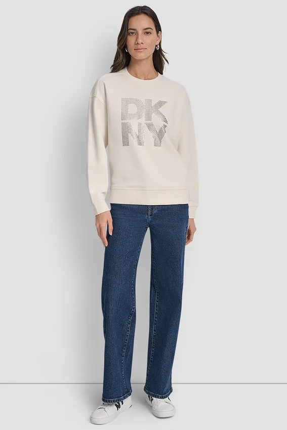 - Sudadera de cuello redondo con mangas largas de hombros caídos y logotipo apilado adornado con adornos de cristales