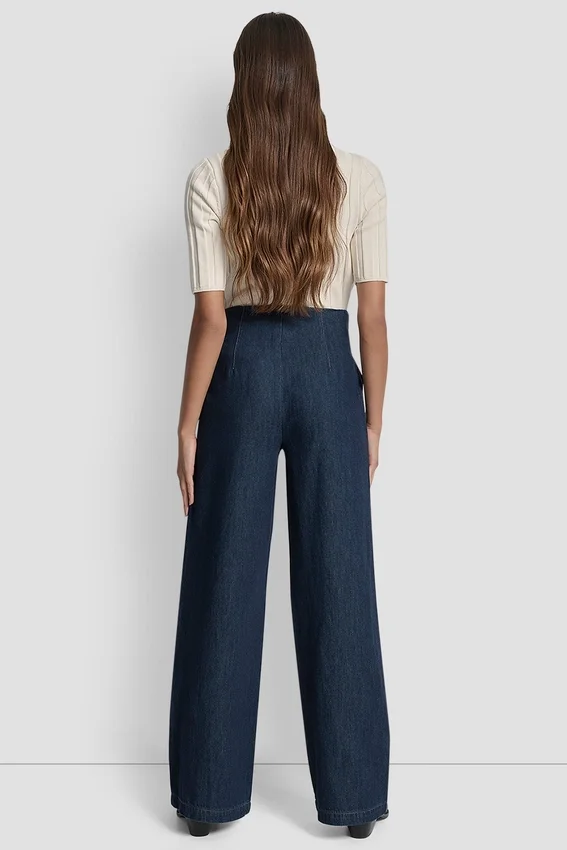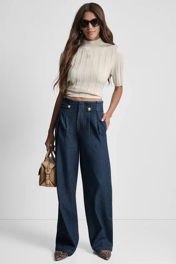 - Pantalones de mezclilla de talle alto, plisados, lavado oscuro y pierna ancha