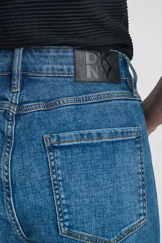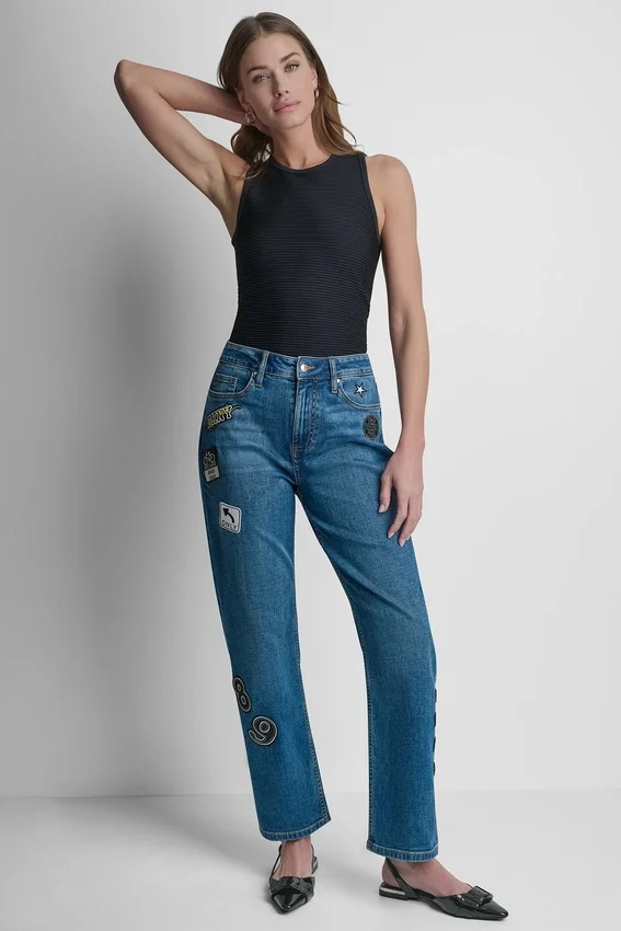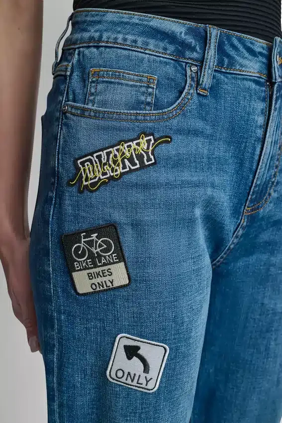 Vaqueros tobilleros de talle medio con perneras rectas, adornados con pins y parches de 1989. Diseño de cinco bolsillos. Cierre con botones y cremallera oculta. Sin forro. Denim de mezcla de algodón: 68 % algodón, 25 % poliéster, 5 % viscosa rayón, 2 % elastano (spandex). Lavar a máquina en frío con ciclo delicado, secar en secadora a baja temperatura. Importado. Estilo n.º: P6Bkbeld