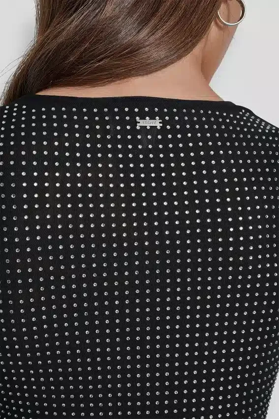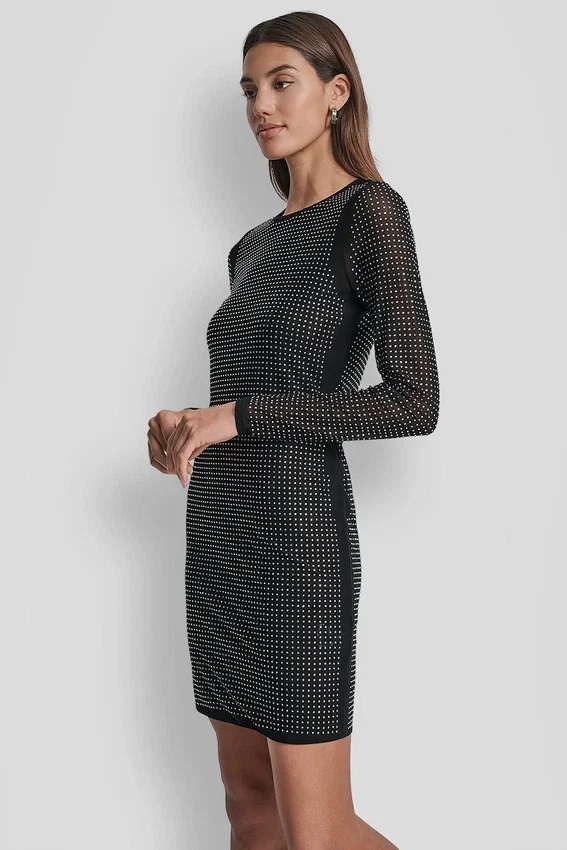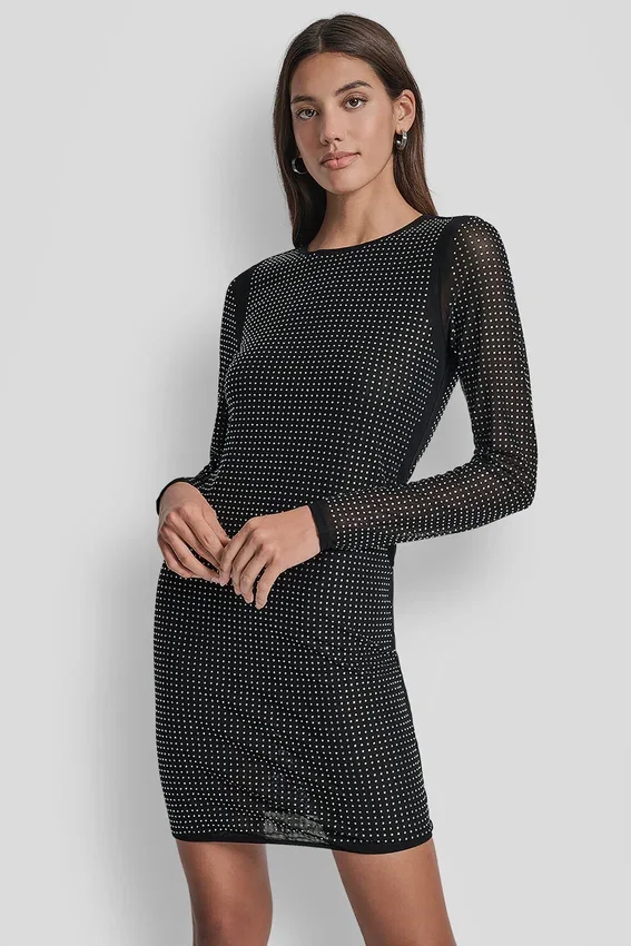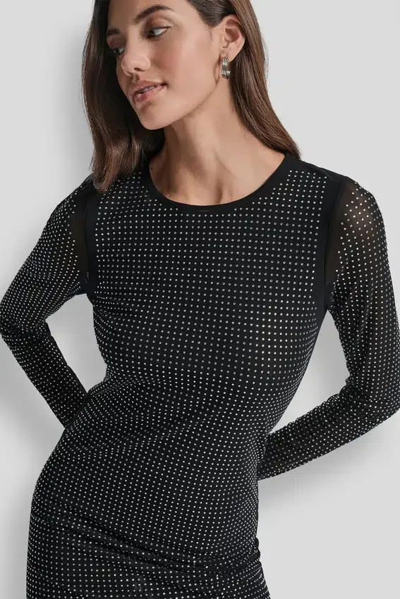 Vestido de malla con tachuelas en forma de cúpula, escote redondo, mangas largas, corte ajustado, cierre sin cremallera, parcialmente forrado (paneles delantero y de espalda forrados, mangas sin forro). Confeccionado en 95 % poliéster y 5 % spandex para una elasticidad cómoda y retención de la forma. Cuidados: Lavar a máquina en frío del revés con colores similares; ciclo suave; usar blanqueador sin cloro