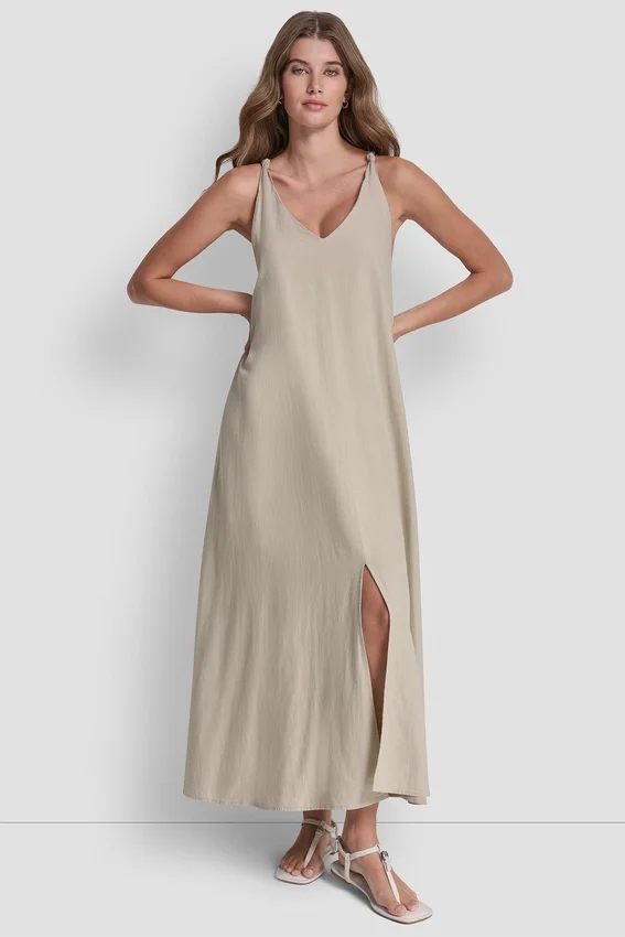 Estilo sin mangas con escote en V y tirantes anudados, silueta en A, largo Maxi, bolsillos en las costuras, forrados, confección en mezcla de lino, 55 % lino, 45 % rayón viscosa, lavar a máquina en frío, ciclo delicado; usar solo blanqueador sin cloro cuando sea necesario; secar en secadora a baja temperatura; planchar a baja temperatura si es necesario, importado, estilo n.º: Dj6D9162