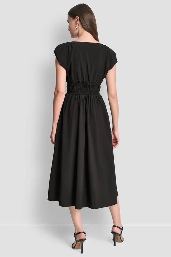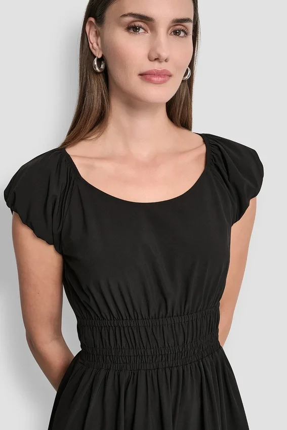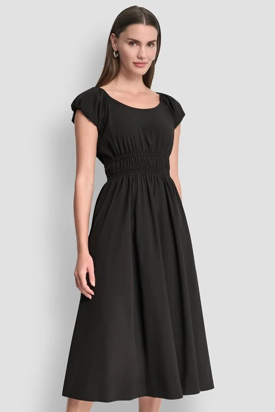 - Vestido midi ajustado y acampanado de cuello redondo con mangas abullonadas cortas y cintura fruncida