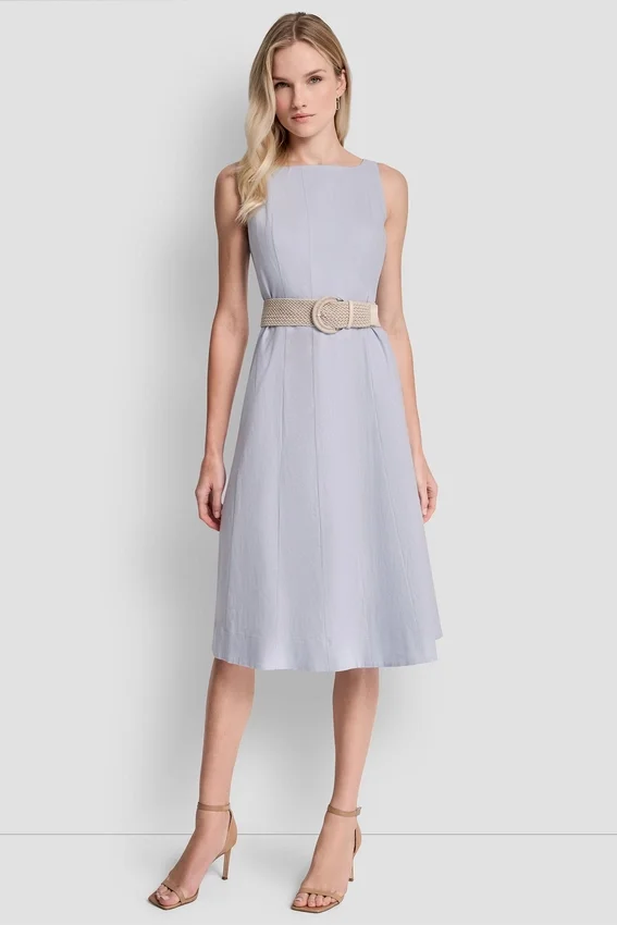 Vestido de verano midi sin mangas, con cuello cuadrado, corte ajustado y acampanado, costuras, cierre con cremallera en la espalda, cinturón extraíble incluido, forrado, mezcla de lino: principal: 55 % lino, 45 % rayón; forro: 100 % poliéster, solo limpieza en seco, importado, n.º de estilo: Dd6Q1R92