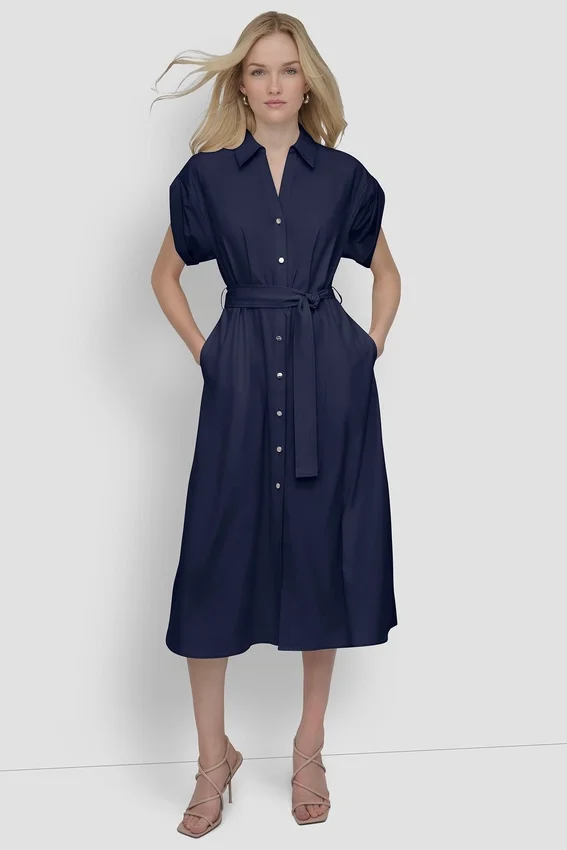 Elegante y versátil, este vestido camisero midi cuenta con mangas largas, un cuello clásico y un diseño con botones en la parte delantera. El lazo ajustable en la cintura crea una silueta favorecedora, lo que lo hace ideal para looks tanto de trabajo como de fin de semana.