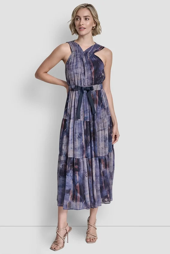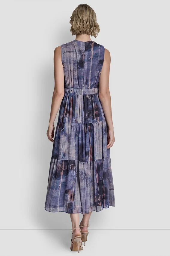 Vestido midi sin mangas, con cuello en V, plisado y estampado, con lazo en la cintura. Cierre oculto en la espalda con corchetes y cremallera. Forrado. Gasa: Tejido principal y forro: 100 % poliéster. Limpieza en seco o lavado a máquina en frío, secar en secadora a baja temperatura. Importado. N.º de estilo: P5Kbgd66