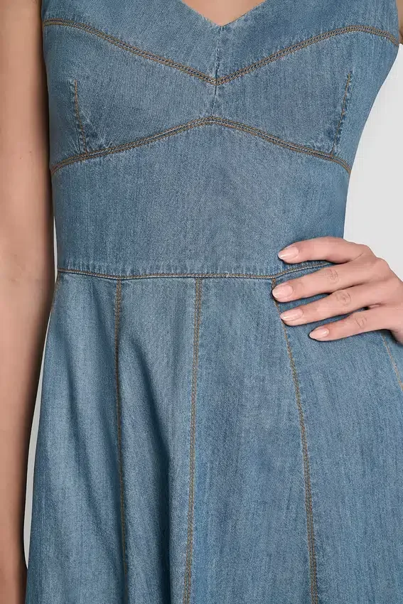 Tonos llamativos, un bolso Satchel de paja y sandalias deslizantes hacen que este vestido midi de mezclilla con corte ajustado y acampanado resalte; combínalo con un delicado cárdigan de punto abierto y estarás lista para la ciudad en segundos.