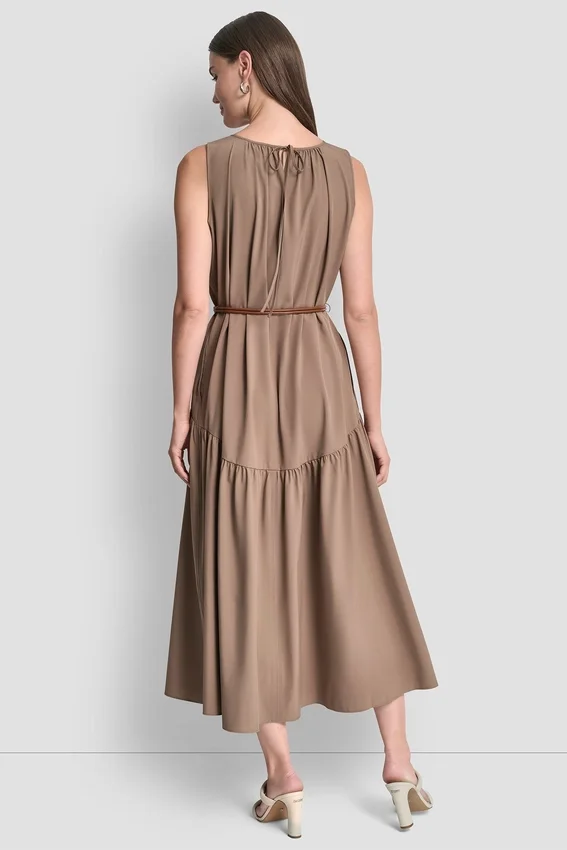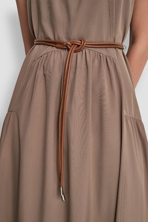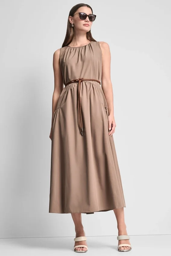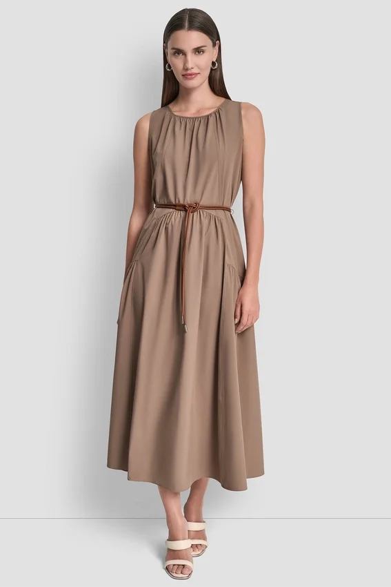 Vestido midi sin mangas, con cuello redondo y cintura baja. Se pone por la cabeza, con cierre de lazo en forma de ojo de cerradura en la espalda. Incluye cinturón de lazo desmontable. Bolsillos de tela en las costuras de las caderas. Sin forro. Cupro: 88 % poliéster, 12 % spandex. Lavar a mano en agua fría; no limpiar en seco ni usar lejía; secar colgado. Importado. N.º de estilo: Dd611S08