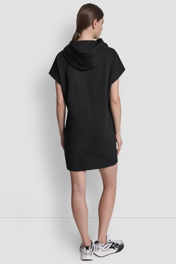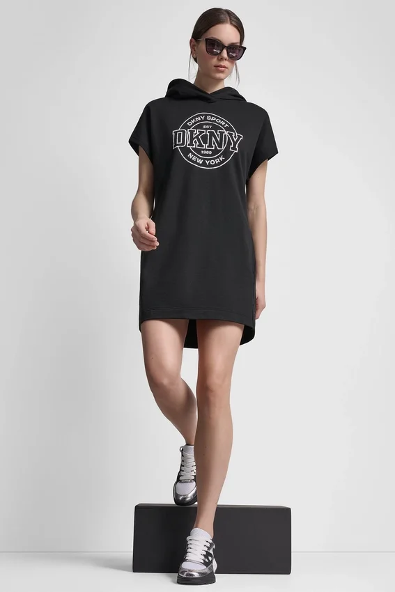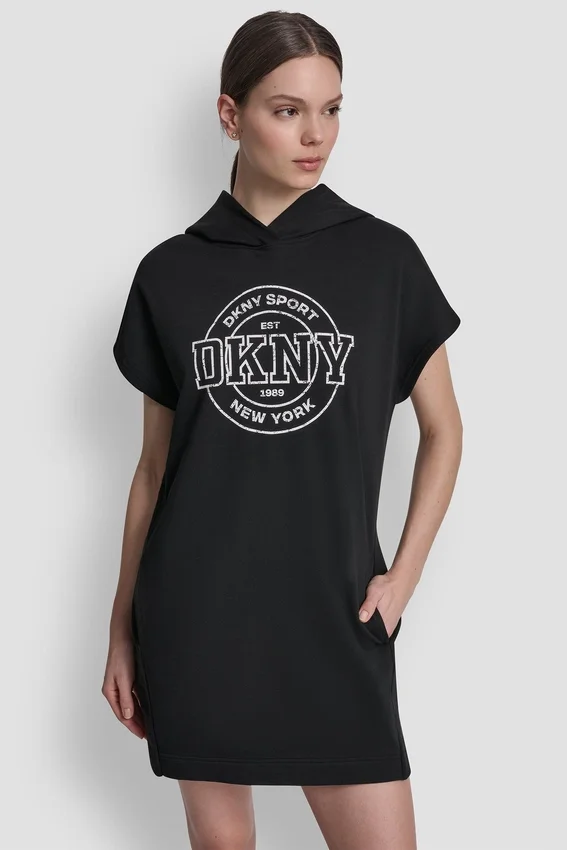 La comodidad se une a la elegancia en este minivestido con capucha y logotipo, con un acabado de estilo universitario. Combínalo con zapatillas bajas y una chaqueta Anorak para lograr un look de Corte Holgado y elegante.