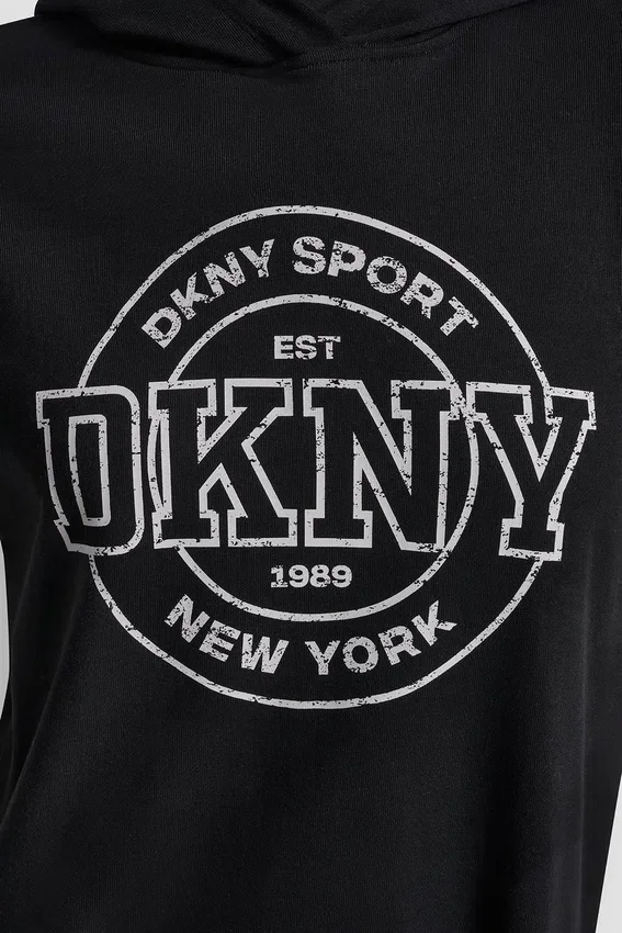- Vestido mini con capucha y logo medallón universitario de manga corta y hombros extendidos